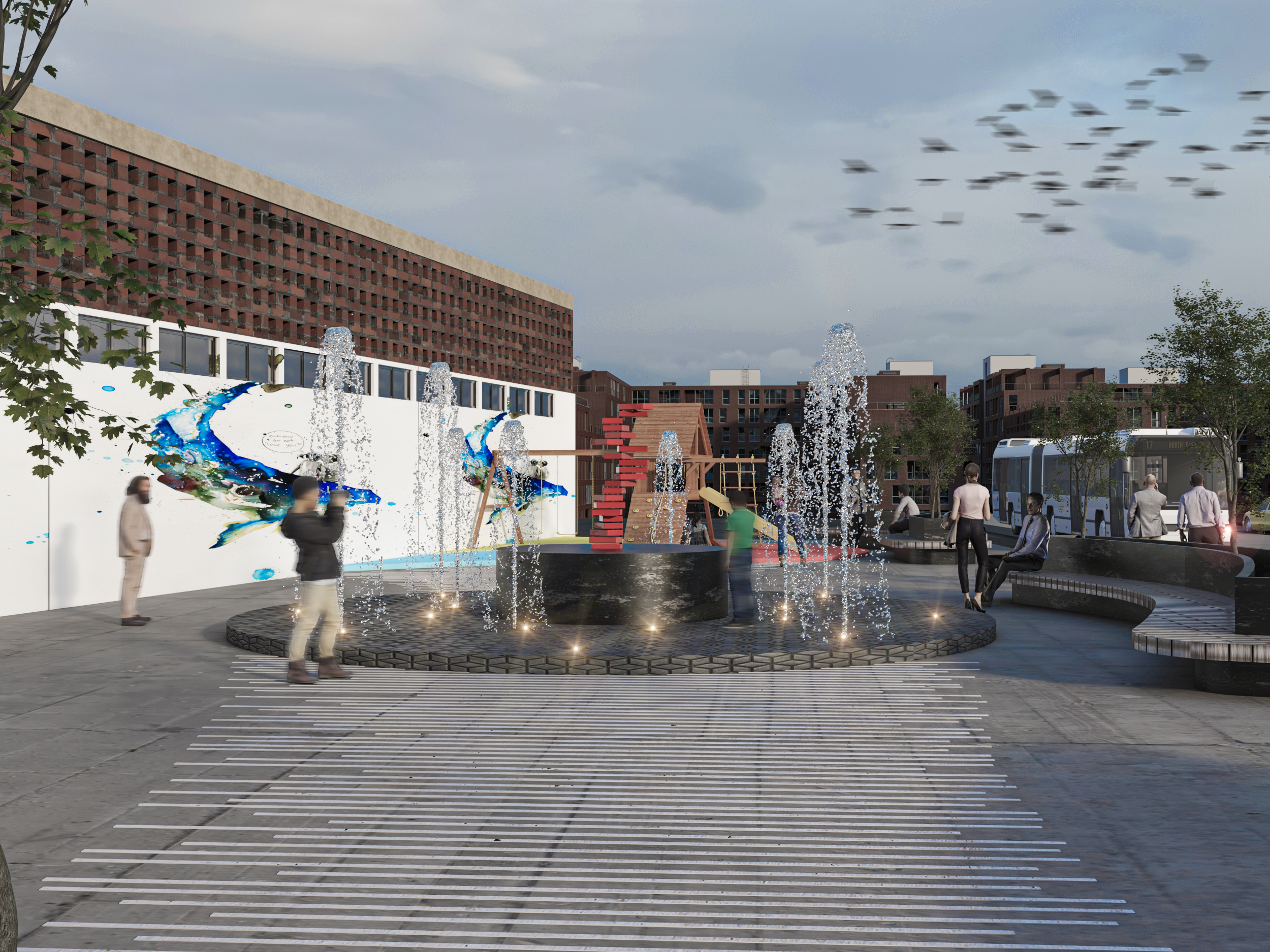 La solución de diseño para “La Normal” se basa en transformar el área en un vibrante centro comunitario a través de una planificación maestra que distribuye estratégicamente elementos de interacción. La inclusión de exuberante vegetación, refrescantes fuentes de agua y áreas de juegos fue clave para crear un diseño inclusivo y multigeneracional, atrayendo a personas de todas las edades con diversas opciones recreativas. Además, los detalles intrincados en el pavimento y un impresionante mural urbano no solo embellecen el espacio, sino que también narran su historia, generando una fuerte identidad y sentido de pertenencia. En conjunto, esta estrategia de diseño promete revitalizar la zona, convirtiéndola en un rincón lleno de vida y creatividad que fusiona comunidad y recreación, inyectando nueva energía a la ciudad de Guadalajara.
