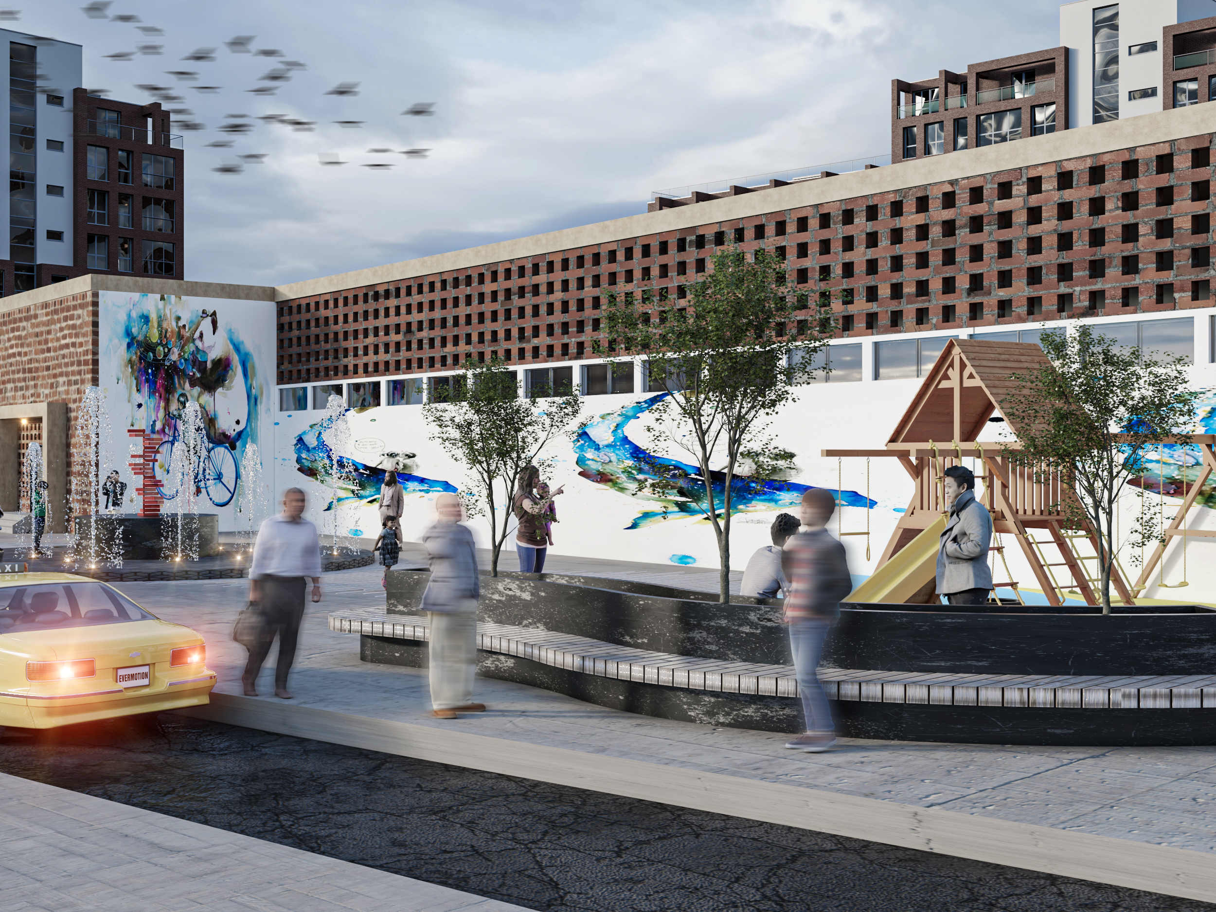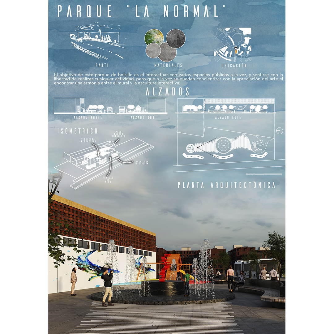“La Normal” en Guadalajara, Jalisco, es una intervención urbana conceptualizada para revitalizar la interacción comunitaria y la recreación en espacios públicos. Este proyecto busca transformar un área en un vibrante centro comunitario mediante la incorporación de exuberante vegetación, fuentes de agua y áreas de juegos. El diseño incluye detalles intrincados en el pavimento y un impresionante mural urbano que narra la historia del lugar. Aunque aún no construido, “La Normal” promete ser un rincón de vida y creatividad, donde la comunidad y la recreación se fusionan para dar nueva energía a Guadalajara.
